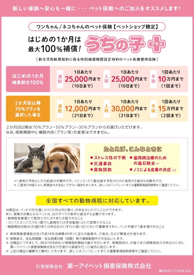 また、先住わんちゃんに向けたペット保険「うちの子」、ペット保険「うちの子ライト」のご案内もしております。