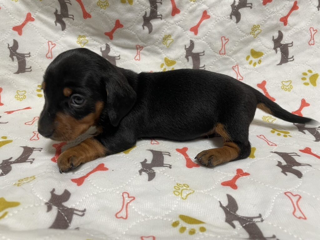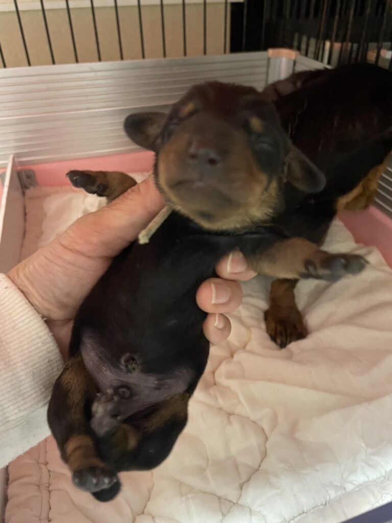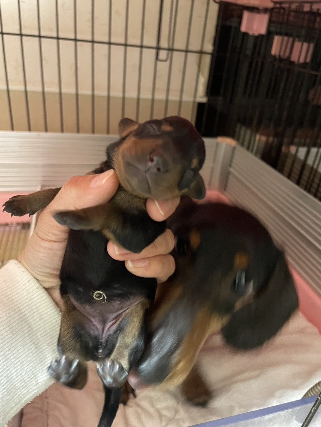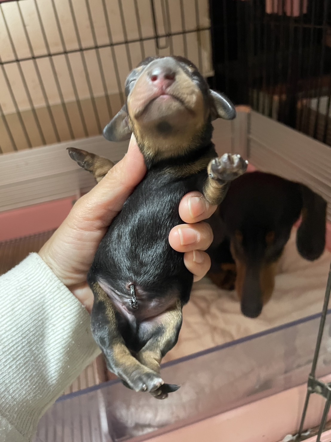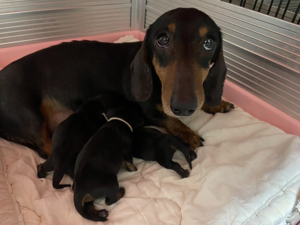 ミニチュアスムースダックスフンドの子犬が産まれました。男の子2頭、女の子1頭でのご紹介です。