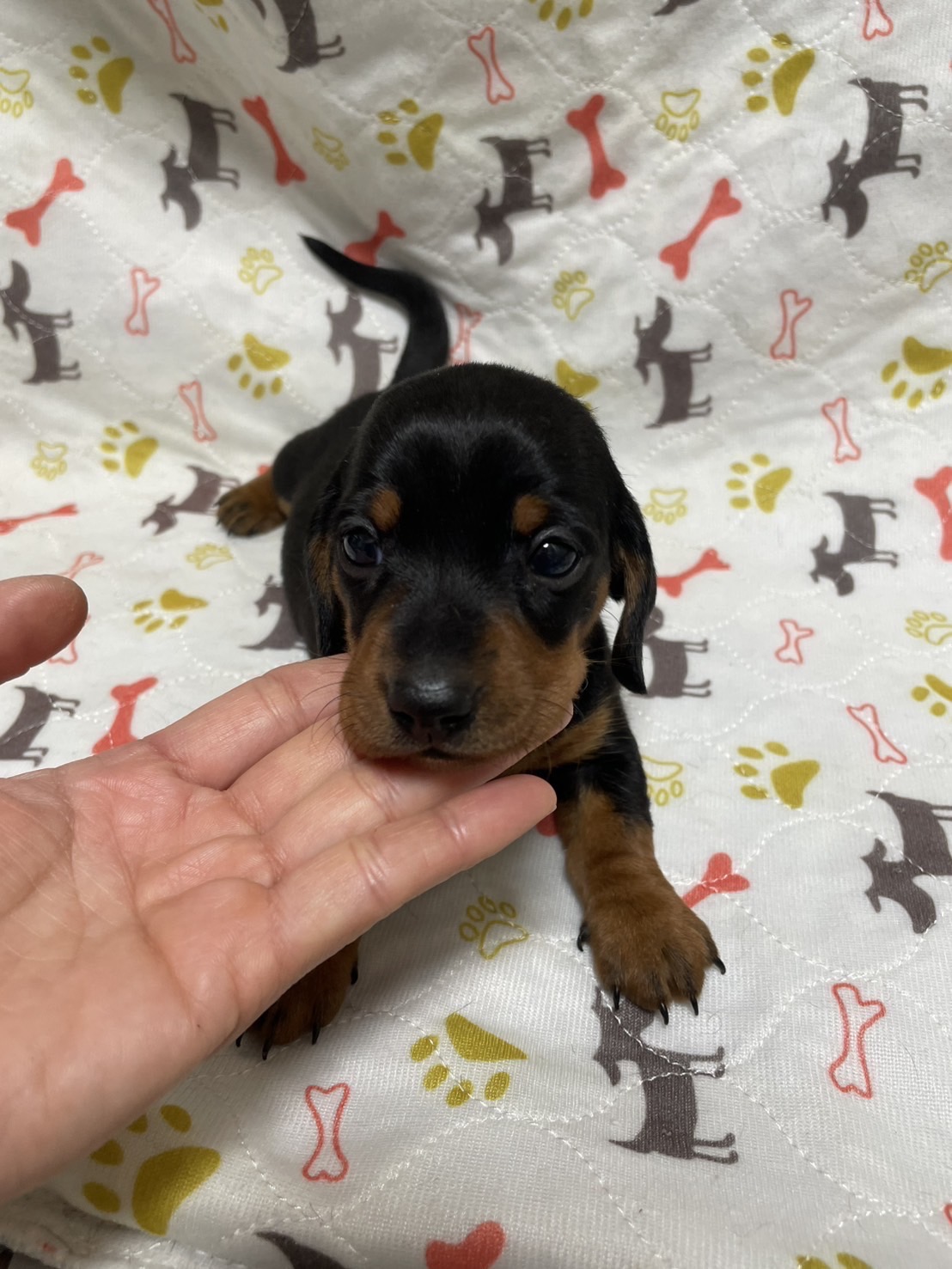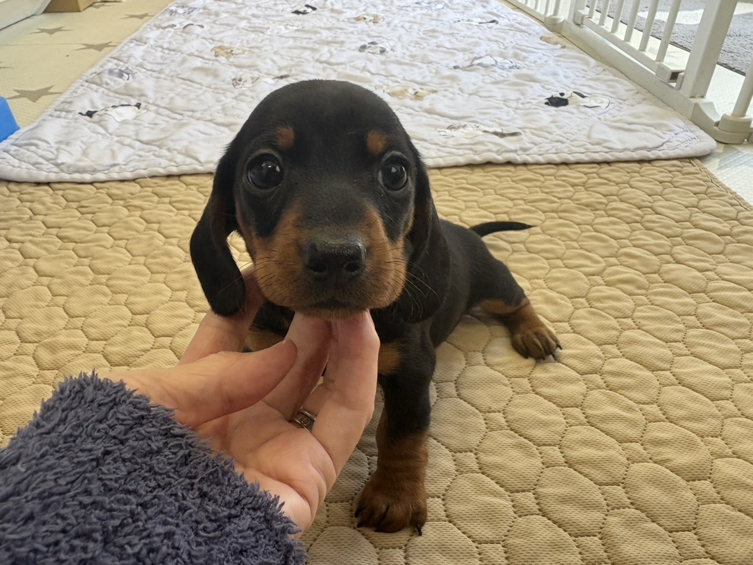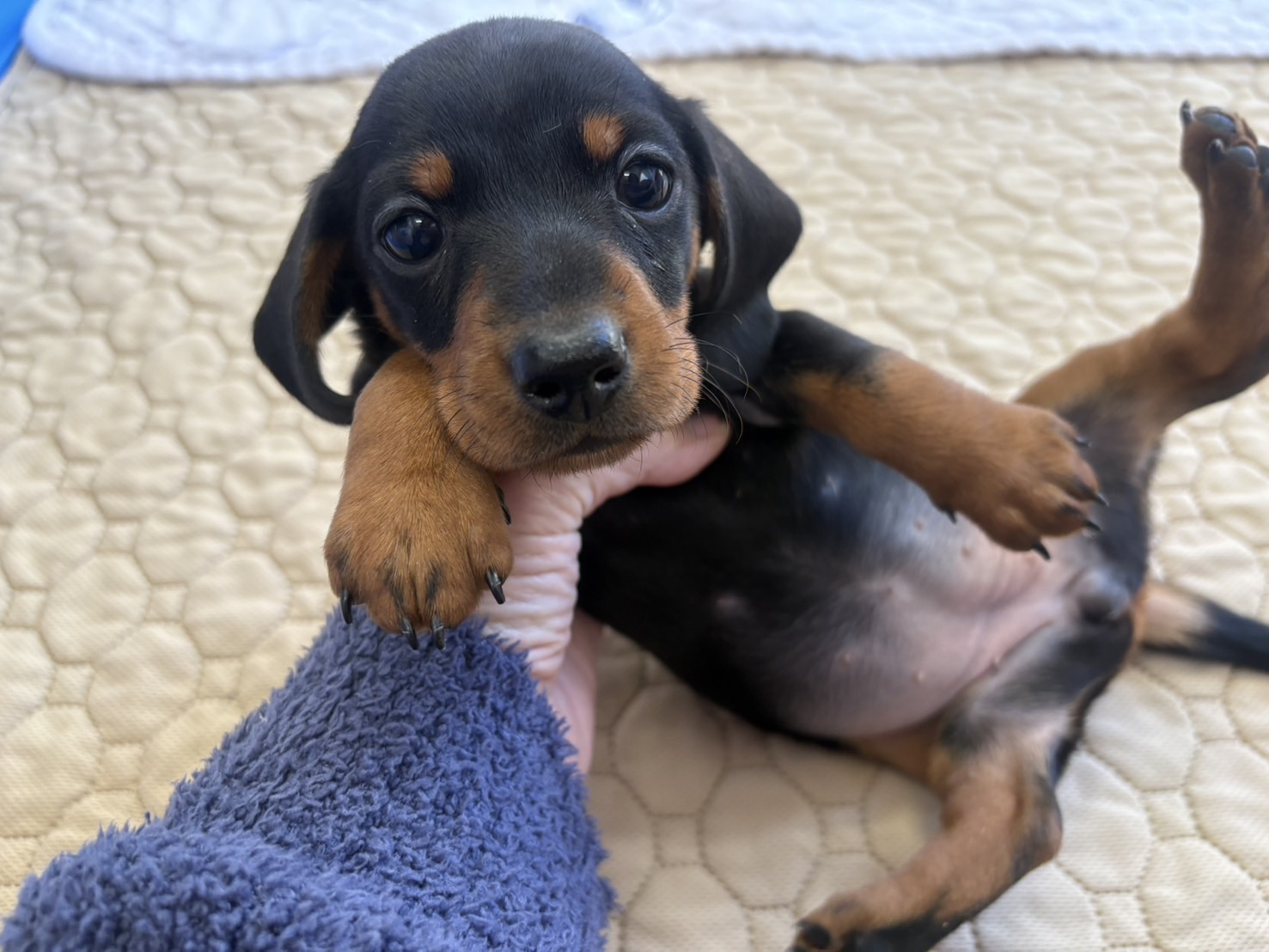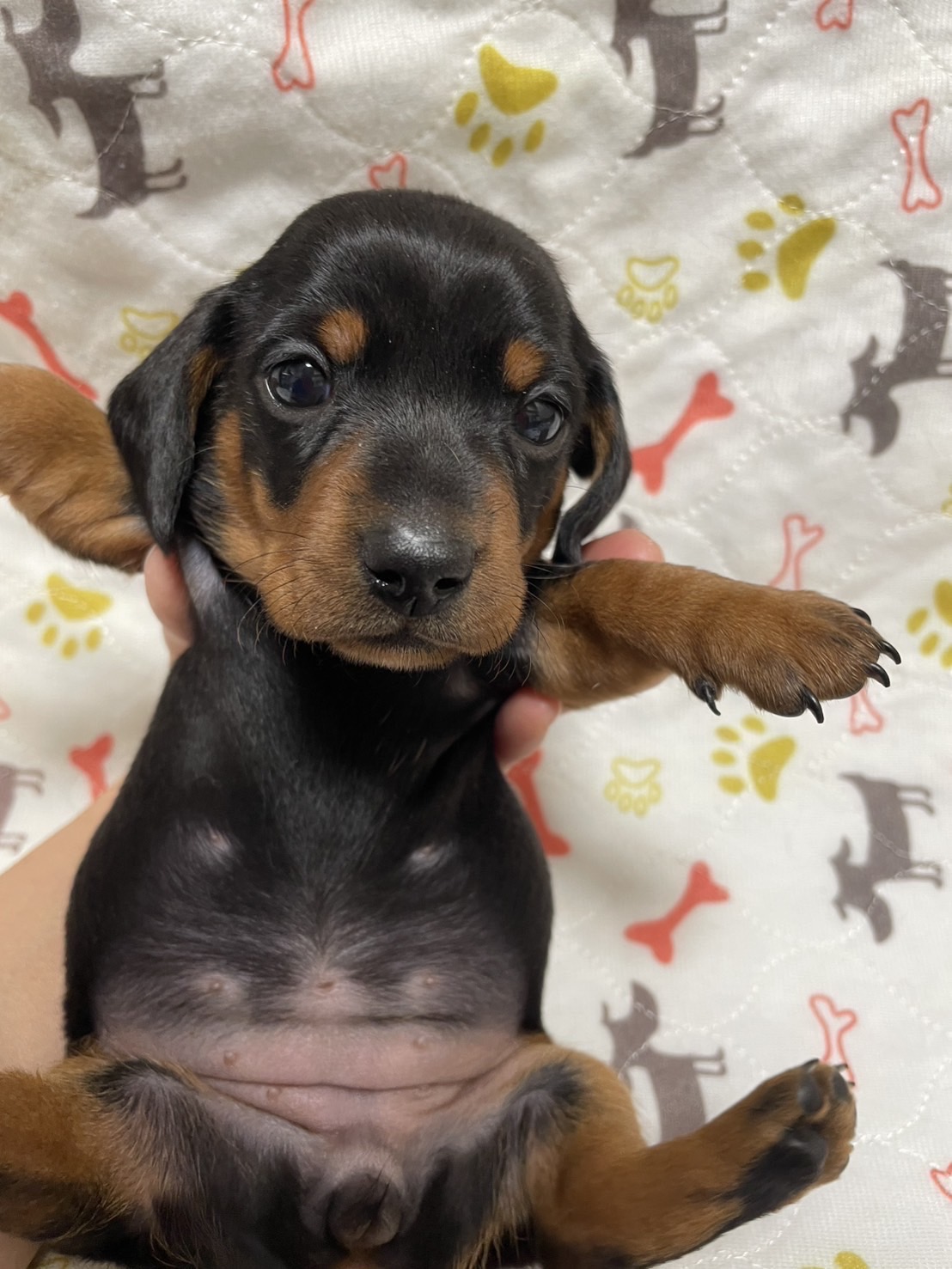 ミニチュアスムースダックスフンドの子犬が産まれました。男の子2頭、女の子1頭でのご紹介です。